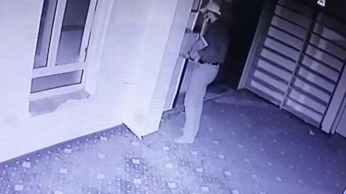 Şahıs, elindeki levyeye benzer bir cisimle sadaka kutusunun bulunduğu odaya girdi.
