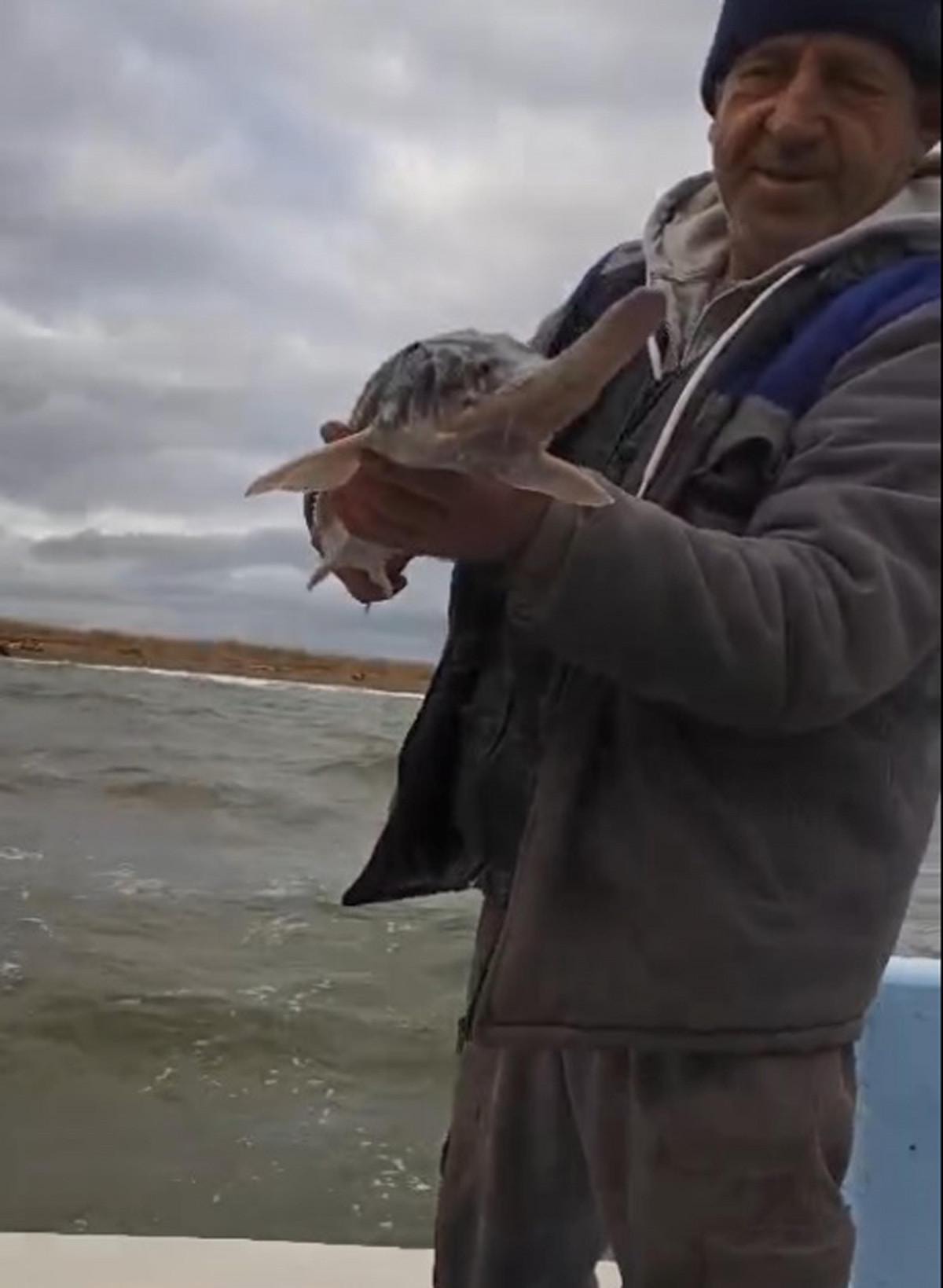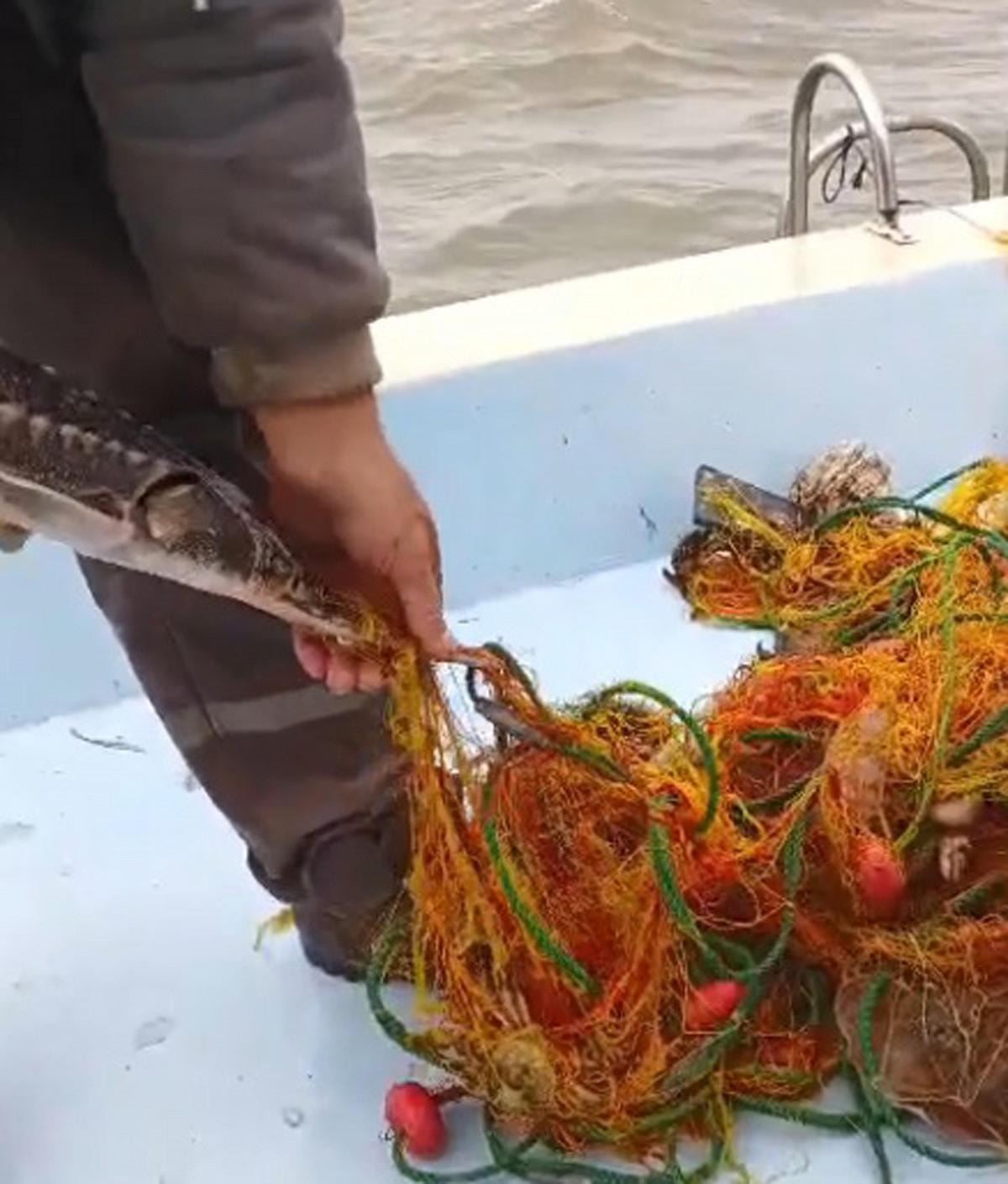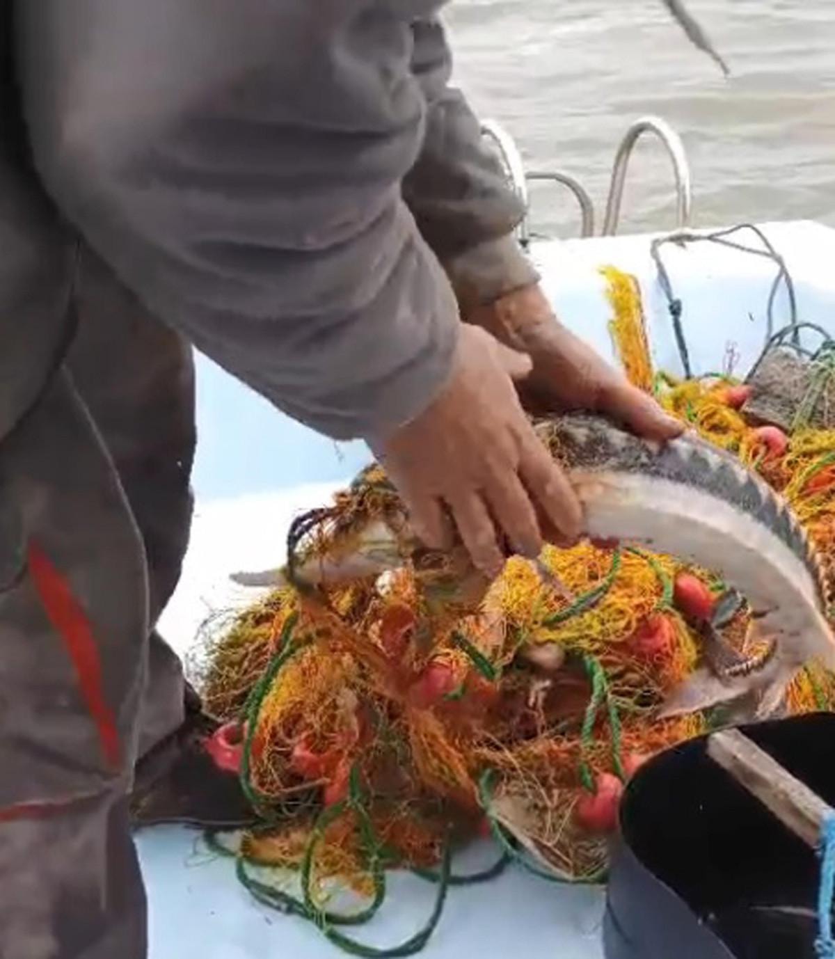 Ağları tekneye çeken Kaynak ve arkadaşları nesli tükenmekte olan koruma altındaki mersin balığıyla karşılaştı.