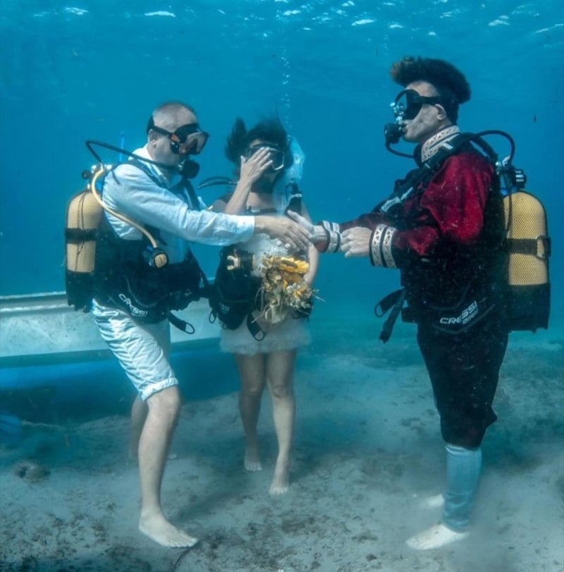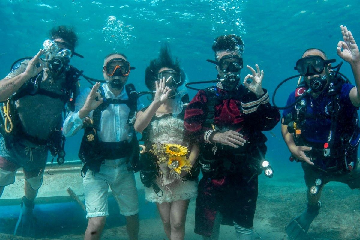 Yapılan hazırlıkların ardından gelin ve damadın yanı sıra belediye başkanı ve şahitler, su altına özel ekipmanlarla tüplü dalış gerçekleştirdi.
