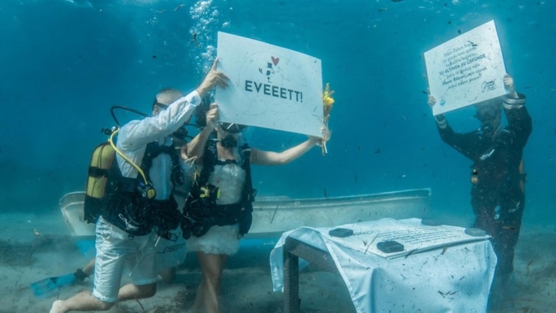 Çift, su altında "Evet" yazılı pankart açtıktan sonra kıyıya çıkarak misafirlerin önünde de nikah defterine imza attı.