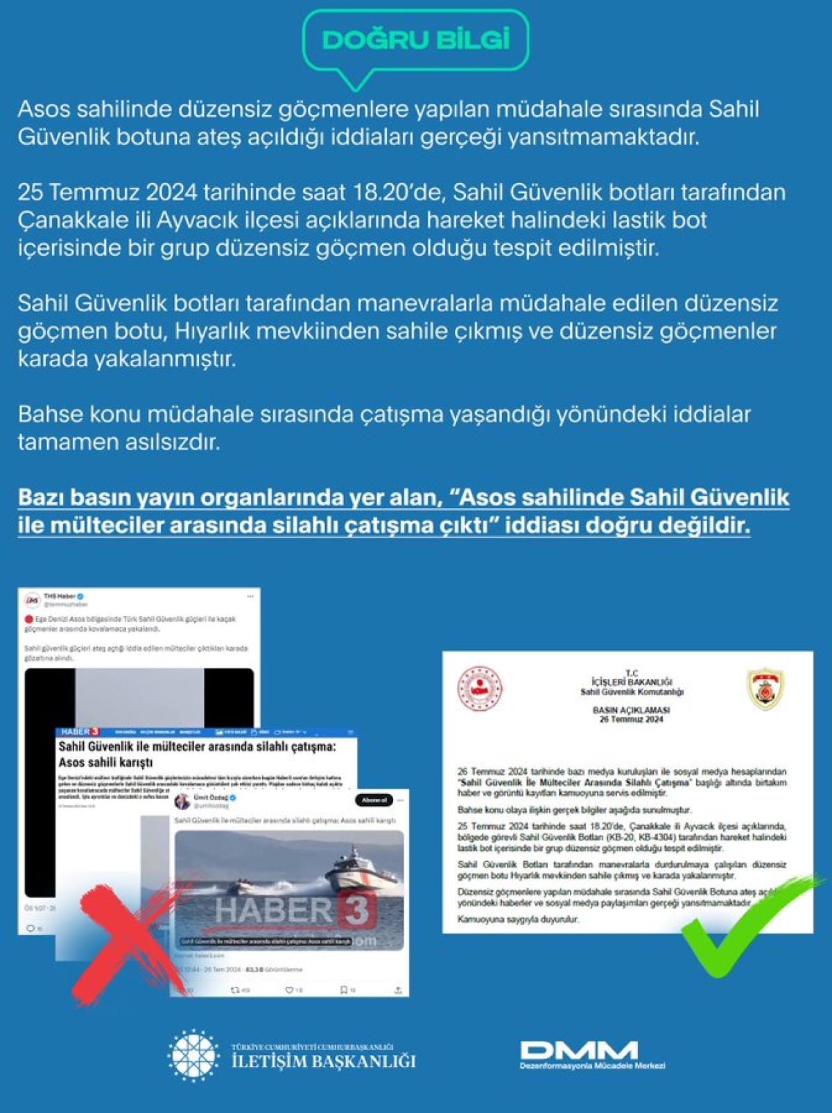Asos sahilinde düzensiz göçmenlere yapılan müdahale sırasında Sahil Güvenlik botuna ateş açıldığı iddiaları üzerine, Cumhurbaşkanlığı İletişim Başkanlığı bünyesindeki Dezenformasyonla Mücadele Merkezi'nden bir açıklama paylaşıldı.