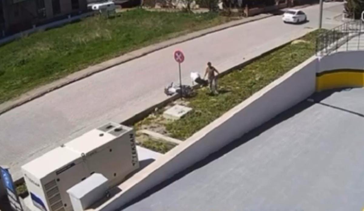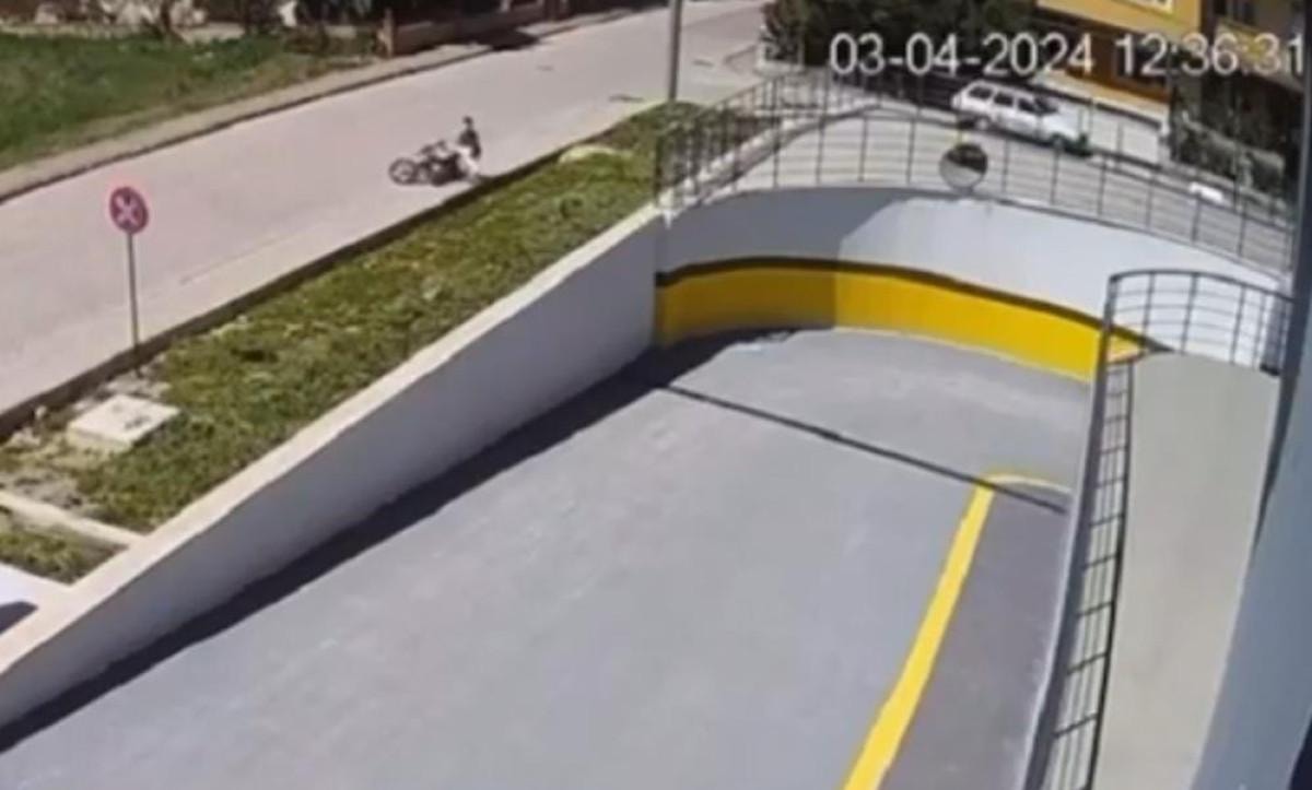 Motosiklet ile birlikte savrulan sürücü ve arkasında bulunan yolcu yaralandı. Sürücünün kaza anı güvenlik kamerasına yansıdı.