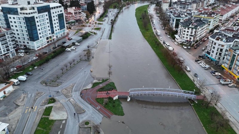 Duraktaki araçlar şoförler tarafından son anda kurtarılırken, Sarıçay yatağındaki bazı tekneler suya gömüldü. Öte yandan taşan Sarıçay, drone ile görüntülendi.
