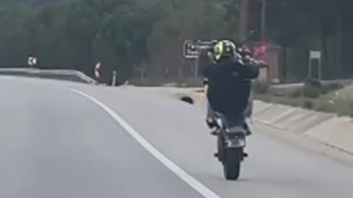 Çanakkale'de kayda alınan görüntülerde, bir motosiklet sürücüsünün tek teker üzerinde trafikte seyrettiği görüldü.
