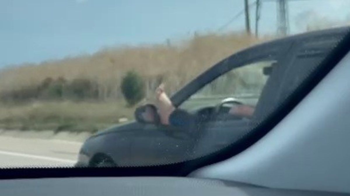 Biga otoyolunda seyir halinde olan bir sürücü, bacağını camdan sarkıtarak otomobil kullandı.