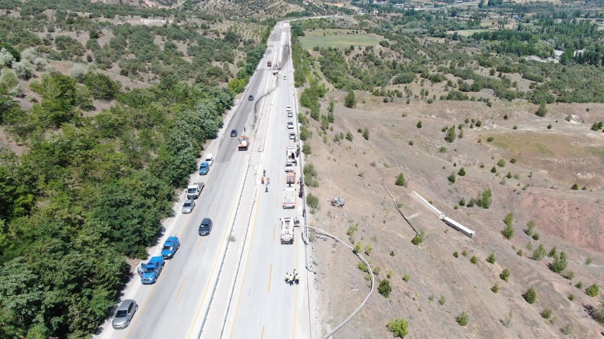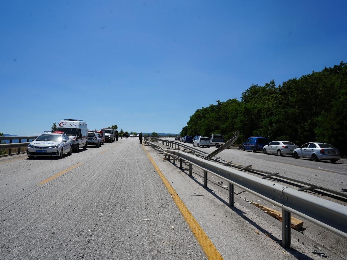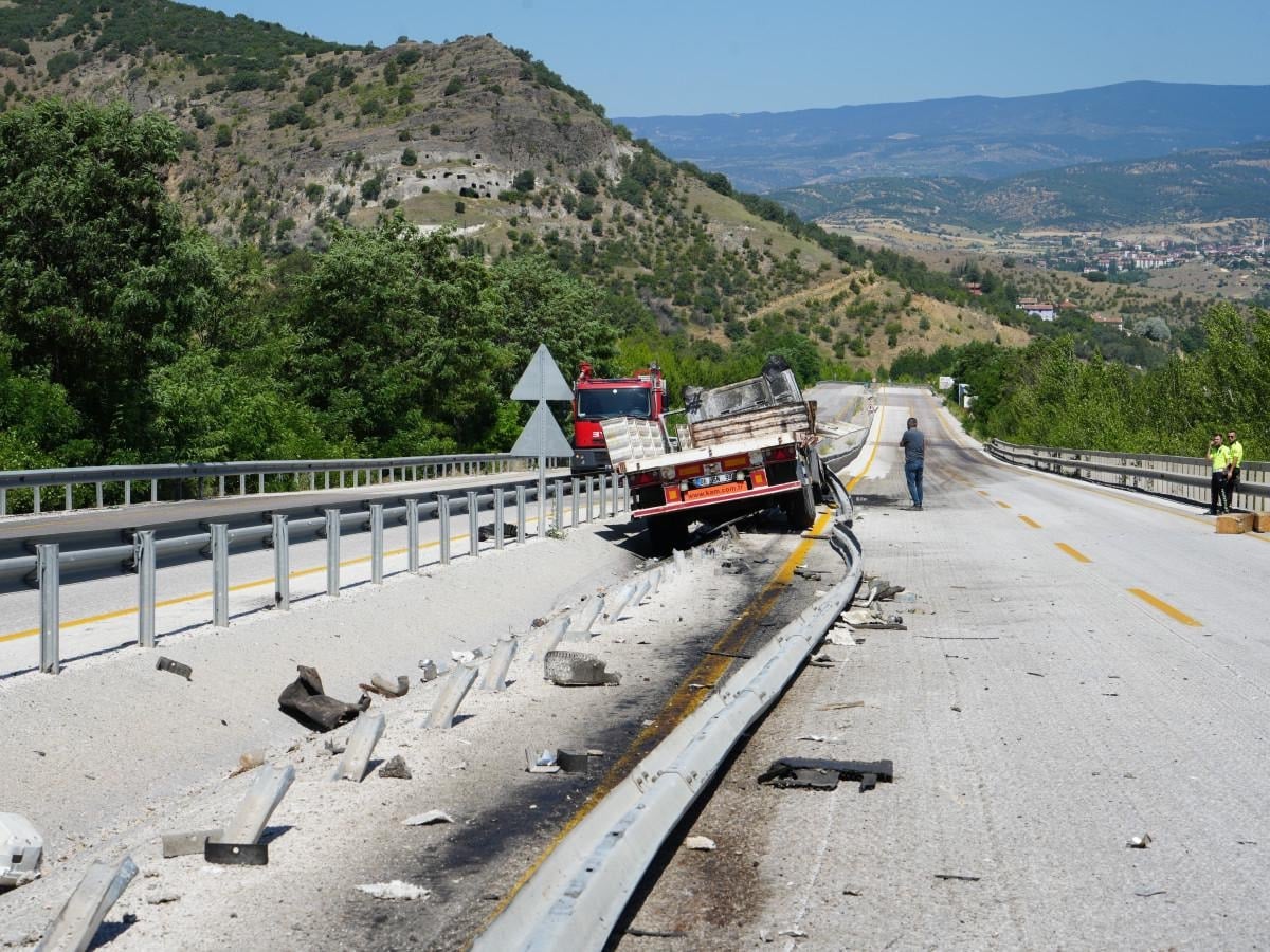 Kereste ve beton bloklar uçuruma ve yol kenarına savruldu. Tır ise refüjde yaklaşık 400 metre sürüklenerek durabildi.