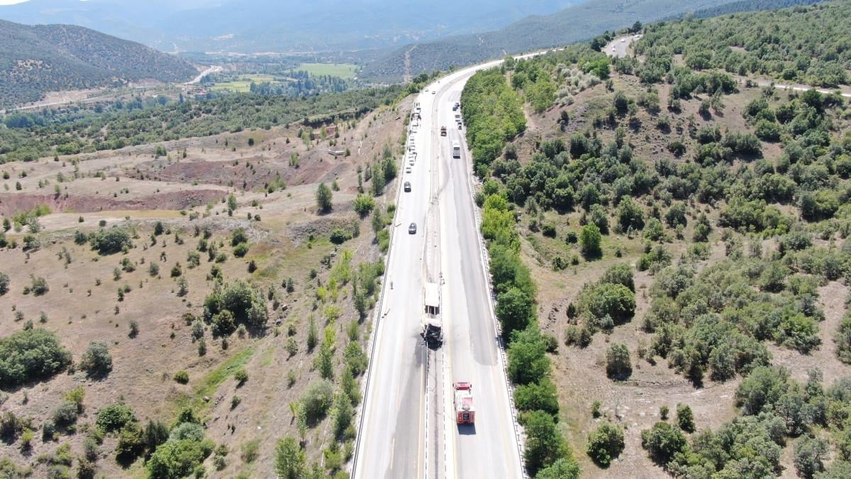 Tır ve otomobilde çıkan yangın itfaiye ekipleri tarafından söndürüldü. Uçurumun kenarında asılı kalan otomobil, yol kenarındaki demir bariyerlere zincirle bağlandı.