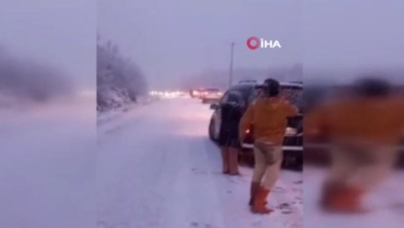 İstanbul Çatalca'da yoğun kar yağışı nedeniyle araçlar yolda kaldı. Bir otomobil kaza yaparken, araç içindeki 2 kişiyi vatandaşlar kurtardı.