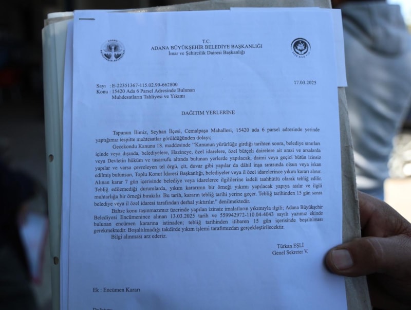 "Gecekondu Kanunu 18. maddesinde 'Kanunun yürürlüğe girdiği tarihten sonra, belediye sınırları içinde veya dışında, belediyelere, hazineye, özel idarelere, özel bütçeli dairelere ait arazi ve arsalarda veya devletin hüküm ve tasarrufu altında bulunan yerlerde yapılacak, daimi veya geçici bütün izinsiz yapılar ve varsa çevreleyen tel örgü, çit, duvar gibi yapılar da dahil inşa sırasında olsun veya iskan edilmiş bulunsun, Toplu Konut İdaresi Başkanlığı, belediyeler veya il özel idarelerince yıkım kararı alınır. Alınan karar 7 gün içerisinde belediye veya idarelerce ilgililerine iadeli taahhütlü olarak tebliğ edilir. Tebliğ edilmediği durumlarda, yıkım kararının bir örneği yıkımı yapılacak yapıya asılır ve ilgili muhtarlığa bir örneği bırakılır. Bu tarih, kararın tebliğ tarihi yerine geçer. Tebliğ tarihinden 15 gün sonra belediye veya il özel idaresi tarafından derhal yıktırılır' denilmektedir. Bahse konu taşınmazın üzerinde yapılan izinsiz imalatların yıkımıyla ilgili; Adana Büyükşehir Belediyesi encümenince alınan 13.03.2025 tarih ve 559942972-110.04-4043 sayılı yazımız ekinde bulunan encümen kararına istinaden; tebliğ tarihinden itibaren 15 gün içerisinde boşaltılması gerekmektedir. Boşaltılmadığı takdirde yıkım işlemi tarafımızca gerçekleştirilecektir."
