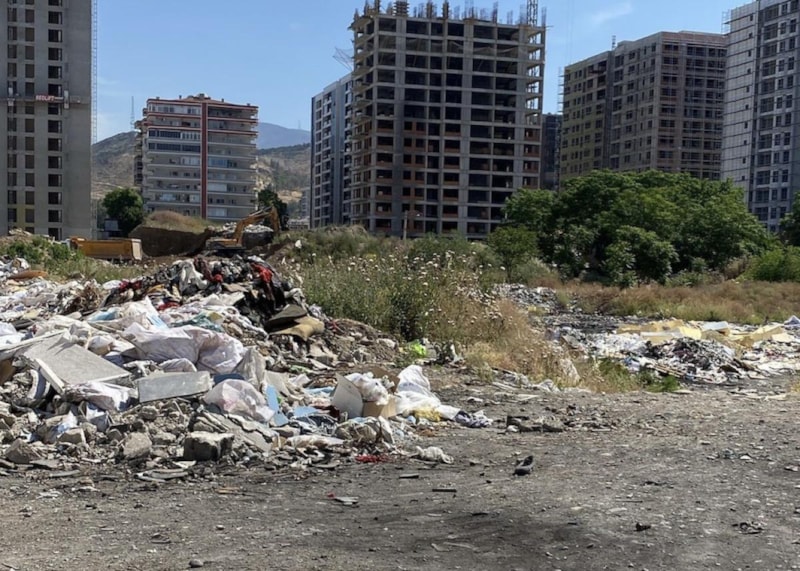 Boş bir arazi, gelişigüzel bırakılan moloz ve çöplerle doldu taştı.