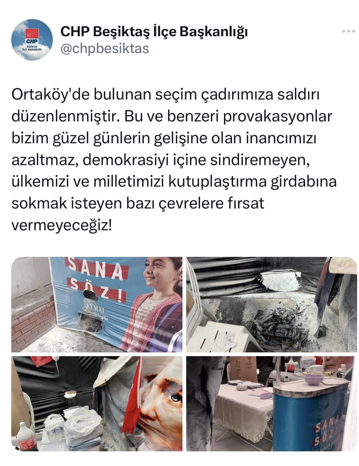 Olayın ardından “saldırı” diyerek sosyal medyada karalama kampanyası başlatan CHP Beşiktaş İlçe Başkanlığı sosyal medya hesabından, “Ortaköy'de bulunan seçim çadırımıza saldırı düzenlenmiştir. Bu ve benzeri provokasyonlar bizim güzel günlerin gelişine olan inancımızı azaltmaz, demokrasiyi içine sindiremeyen, ülkemizi ve milletimizi kutuplaştırma girdabına sokmak isteyen bazı çevrelere fırsat vermeyeceğiz!” açıklamasını yaparken, Beşiktaş Belediye Başkanı Rıza Akpolat ise sosyal medya hesabından, “Ortaköy'de seçim çadırımıza düzenlenen saldırı dolayısıyla çok üzgünüz. Emniyet mensuplarımız süreci yakından takip ediyor. Barışım ve kardeşliğin hakim olduğu yarınlar baharla birlikte gelecek.” açıklamasında bulundu.