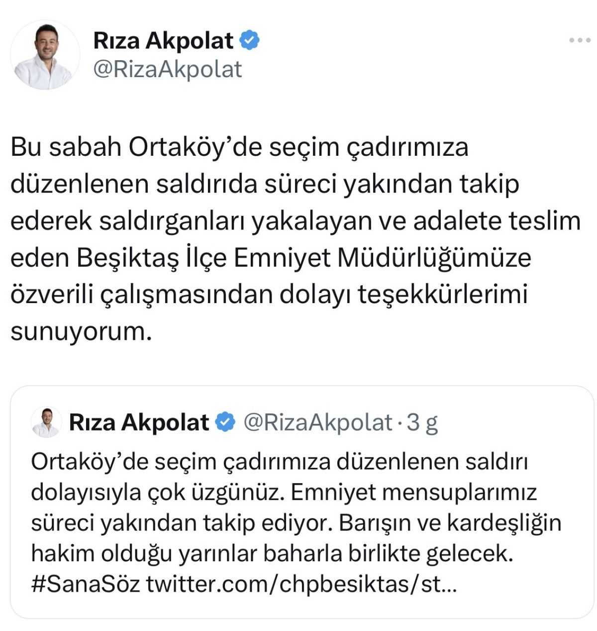 Şahsın yakalanmasının ardından Beşiktaş Belediye Başkanı Rıza Akpolat, sosyal medya hesabından, “Bu sabah Ortaköy'de seçim çadırımıza düzenlenen saldırıda süreci yakından takip ederek saldırganları yakalayan ve adalete teslim eden Beşiktaş İlçe Emniyet Müdürlüğümüze özverili çalışmasından dolayı teşekkürlerimi sunuyorum.” açıklamasında bulundu.