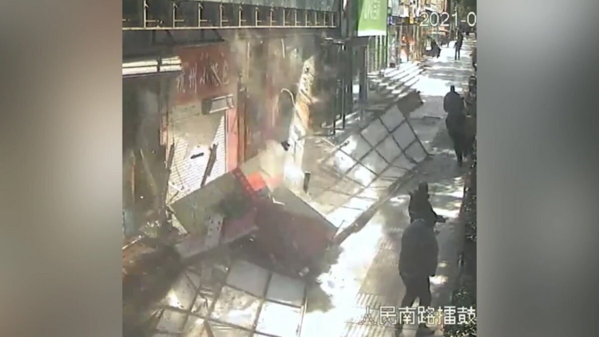 Çin’in Hubei eyaleti Shiyan şehrindeki iş yerinin önünde oturan kadının üzerine, hemen arkasında bulunan iki reklam panosu düştü.