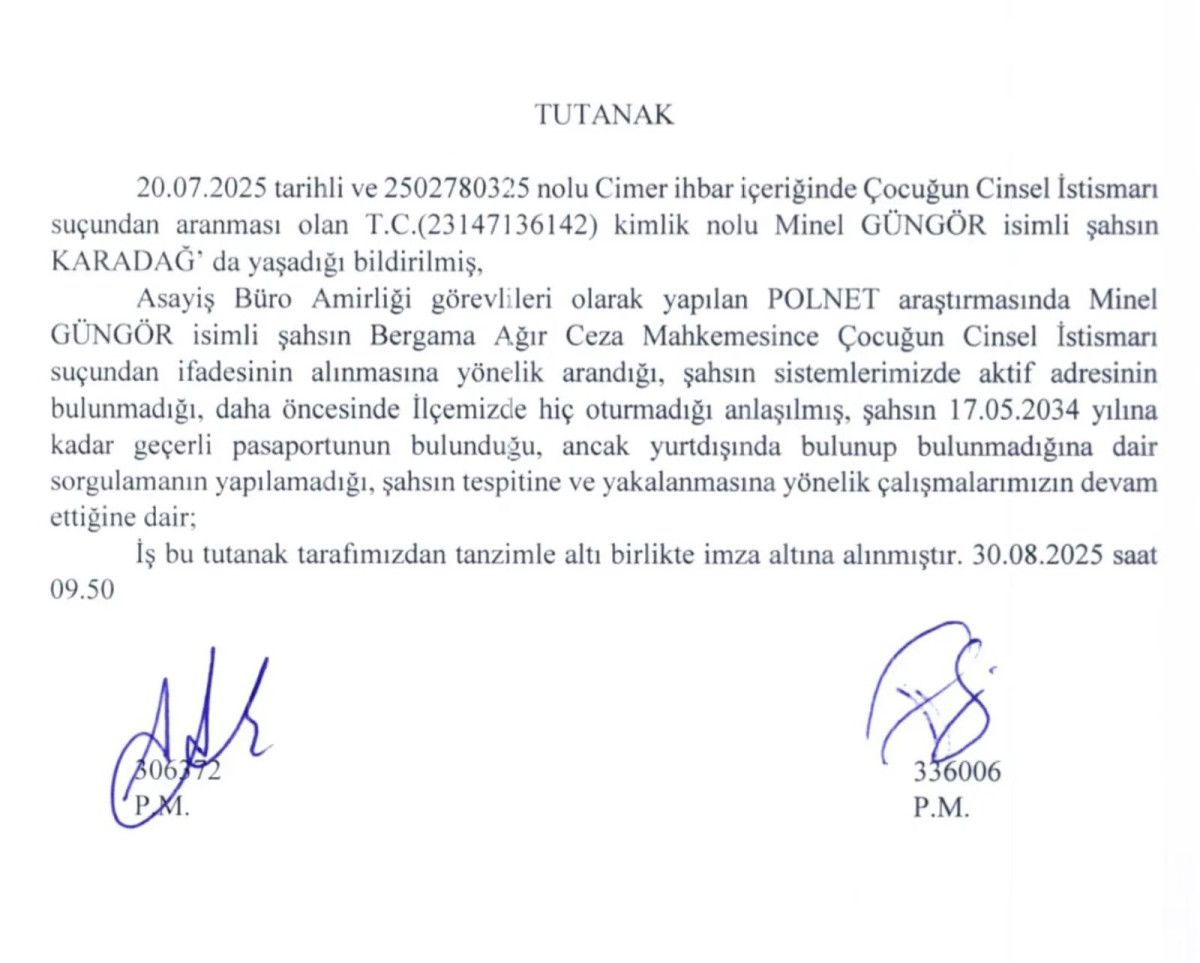 İzmir Bergama’da 2024 yılında, 15 yaşındaki bir kız çocuğuna yönelik “çocuğun nitelikli cinsel istismarı” suçlamasıyla 26 yaşındaki Minel Güngör hakkında yakalama kararı çıkarıldı ve Türkiye içinde aranırken Karadağ’a kaçtığı resmi olarak tespit edildi.
