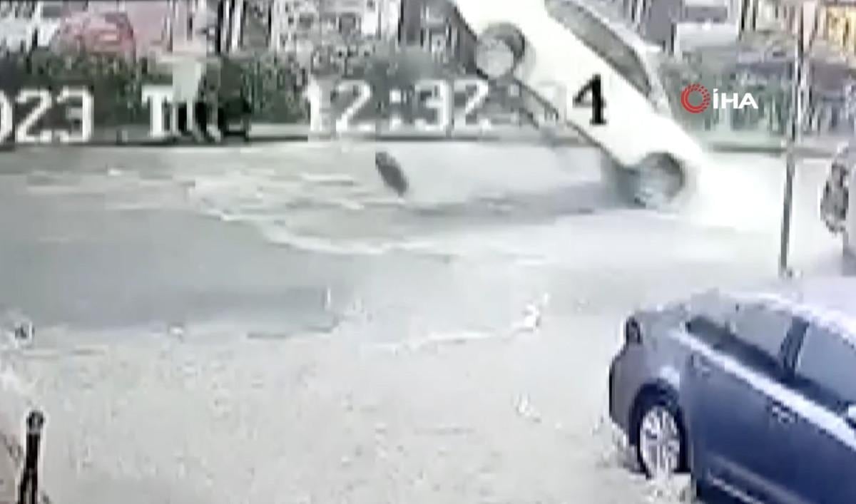 O sırada seyir halindeki otomobil, yoldaki rögar kapağına çarparak metrelerce savuruldu.