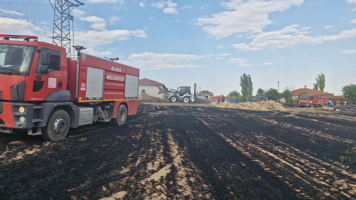 Çorum'un Alaca ilçesine bağlı Çal köyünün girişindeki bir elektrik direğinden çıkan kıvılcımlar, rüzgarın da etkisiyle çevresindeki kuru otları tutuşturarak 3 farklı noktada yangına sebep oldu.