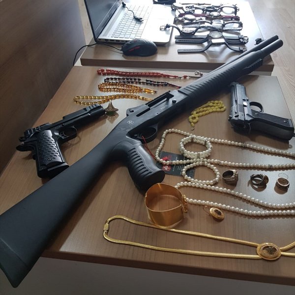 Otelde yapılan aramada, Binevler'deki evden çalınan dizüstü bilgisayar, kol saati ve kurusıkı tabancanın yanı sıra 13 değişik markalarda kol saati, 12 gümüş yüzük, 5 tespih, çeşitli takı malzemeleri, altın renginde imitasyon takı seti, ruhsatsız tüfek ve 2 kurusıkı tabanca ele geçirildi.