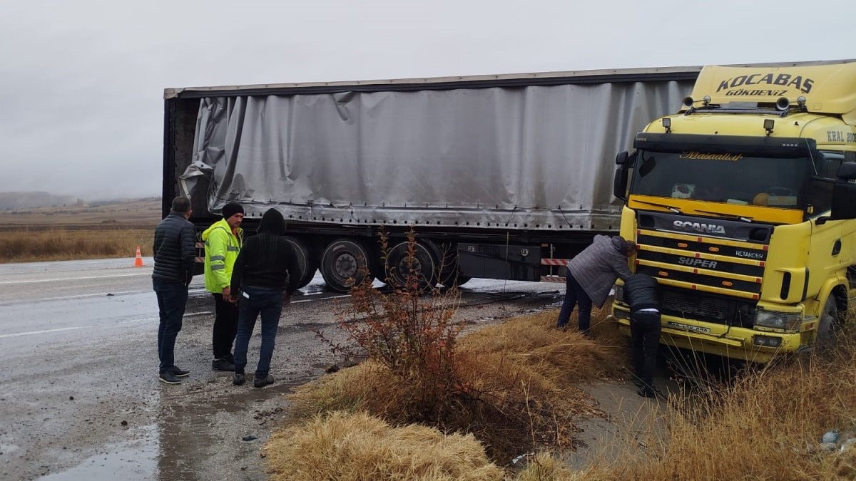 Çorum-Alaca karayolu Camili köyü mevkiinde Deniz K. idaresindeki tır, yağış sebebiyle kayganlaşan yolda sürücüsünün hakimiyetini kaybetmesi neticesinde kontrolden çıktı.
