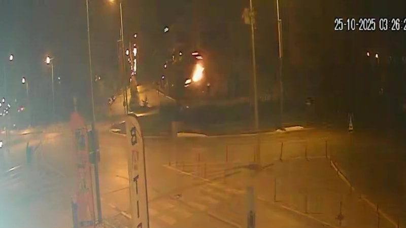 Bir işyerinin güvenlik kamerasına yansıyan görüntülerde, süratle gelen otomobilin kasisten sekip anıta çarptığı, çarpmanın ardından kısa süreli alev aldığı ve yolun ortasına düştüğü görülüyor.