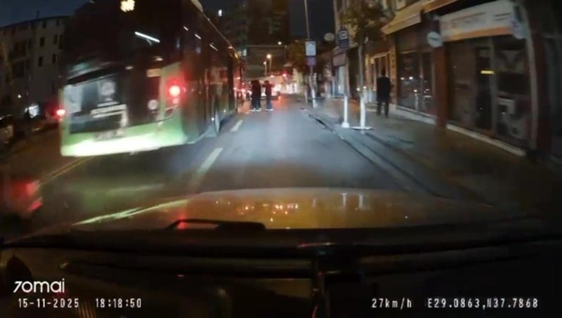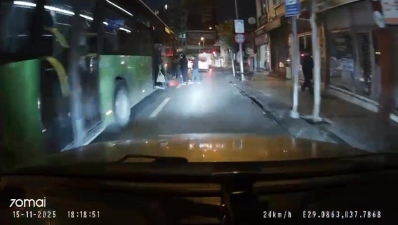 Araç kamerasına yansıyan o anlarda sorumsuz otobüs şoförü, yolcu durağına yanaşmak yerine yol ortasında kapıları açarak yolcu indirme ve bindirme yaptı.