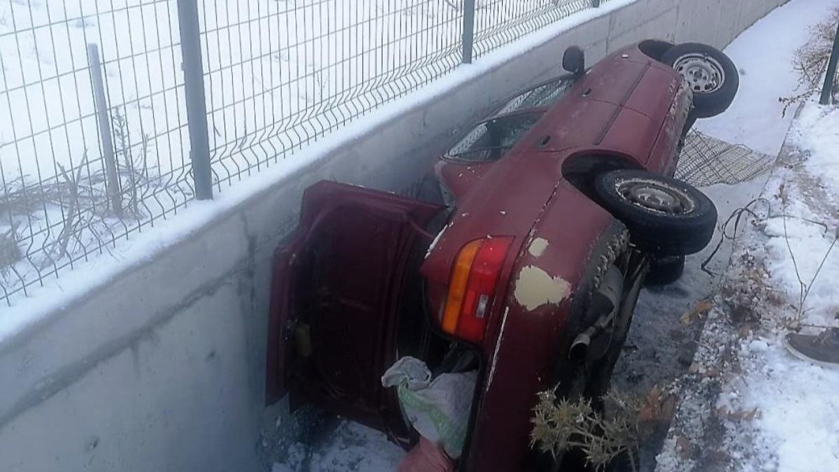 Denizli'de Çameli Yeni Mahalle Andız Yapı yolu üzerinde meydana gelen kazada buzlanma nedeniyle kontrolden çıkan otomobil kontrolden çıkarak yol kenarındaki kanala düştü.