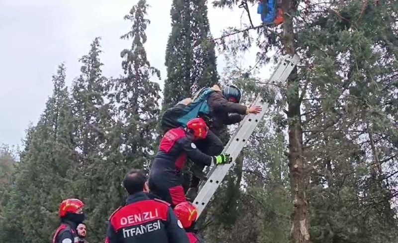 Pamukkale ilçesinde Dinamit Tepesi'nden uçuş yapan Sueda Nur Çelik (24), iniş sırasında paraşütünün bir ağaca takılması sonucu mahsur kalırken, itfaiye tarafından kurtarıldı.