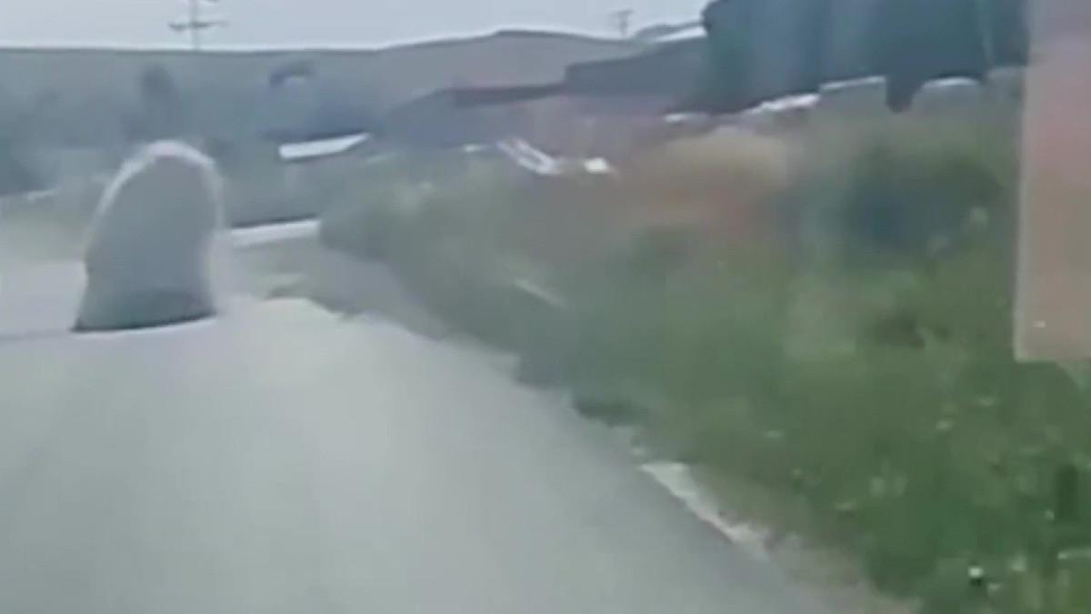 Facianın kıl payı atlatıldığı anlara ait görüntülerde, virajı dönen tırın dorsesinden mermer bloğun yola düştüğü ve otomobilin manevra yaparak mermere çarpmaktan kurtulduğu anlar yer aldı.