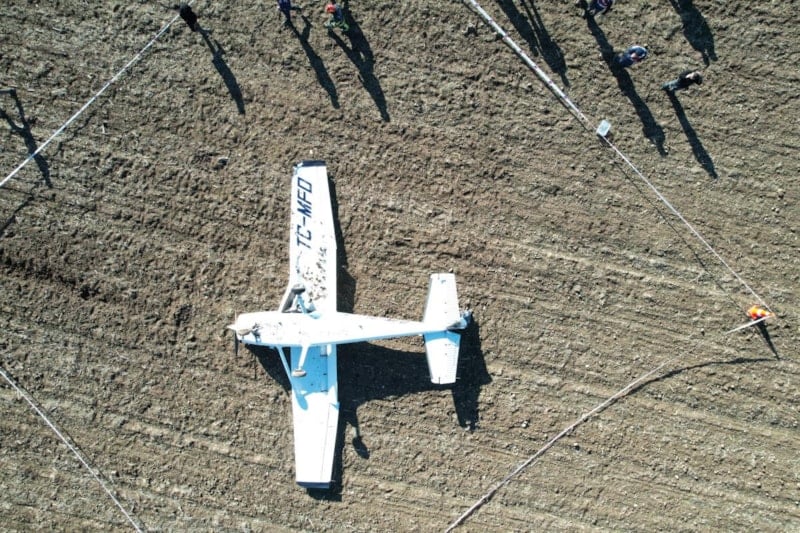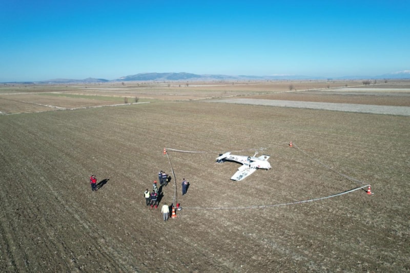 Tarlaya zorunlu iniş yaptıktan sonra ters dönen eğitim uçağı, drone ile havadan görüntülendi. Ters dönen uçakta başlatılan incelemelerin devam ettiği bildirildi.