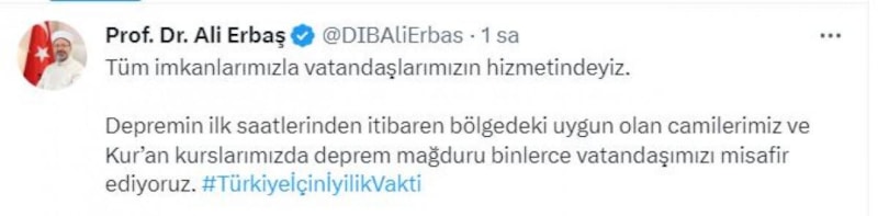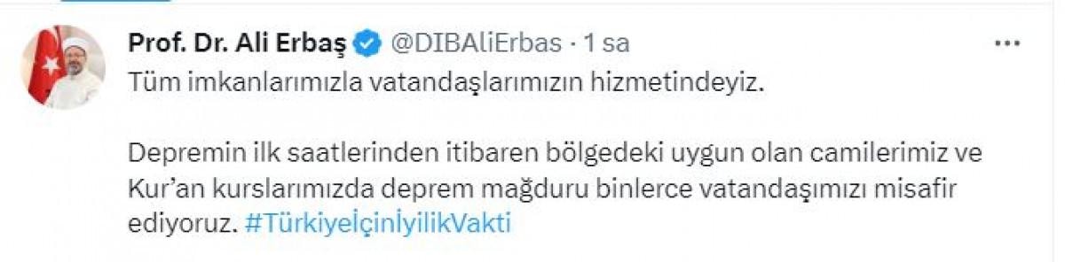 Depremlerden etkilenen vatandaşlara cami ve Kur'an kurslarının açılacağını belirten Erbaş, sosyal medya hesabından yaptığı paylaşımda şu ifadelere yer verdi: