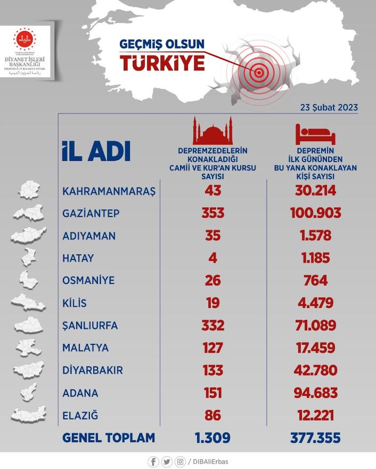 Kahramanmaraş’ta 30 bin 214, Gaziantep’te 100 bin 903, Adıyaman’da 1578, Hatay’da 1185, Osmaniye’de 764, Kilis’te 4 bin 479, Şanlıurfa’da 71 bin 89, Malatya’da 17 bin 459, Diyarbakır’da 42 bin 780, Adana’da 94 bin 683 ve Elazığ’da 12 bin 221 kişi olmak üzere toplam 377 bin 355 kişi, uygun olan cami ve Kur’an kurslarında misafir edildi.