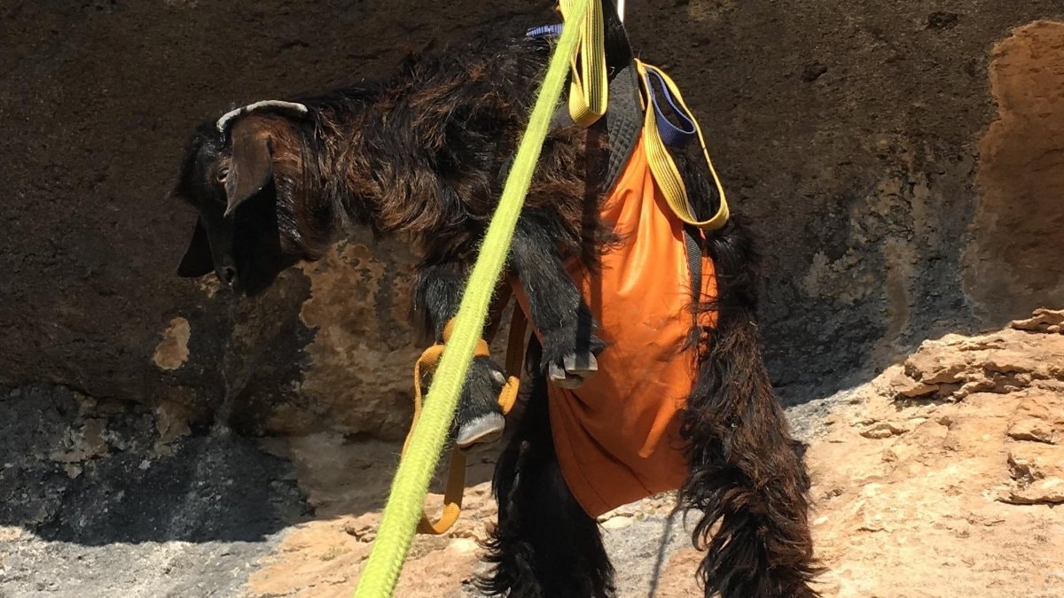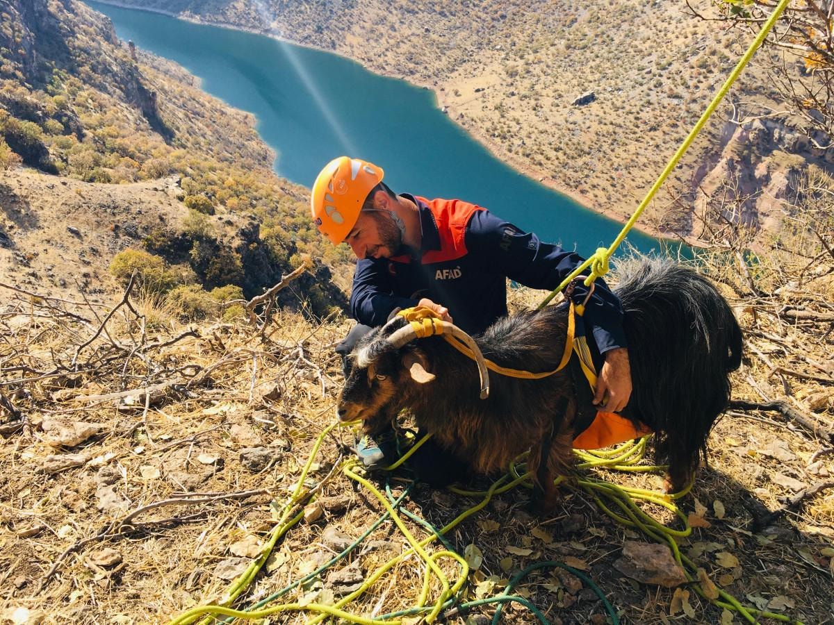 İhbar üzerine bölgeye sevk edilen 5 kişilik doğa arama-kurtarma ekibi, keçileri 3 gündür sıkıştıkları kayalıklardan halat yardımıyla güvenli bir şekilde alarak sahibine teslim etti.