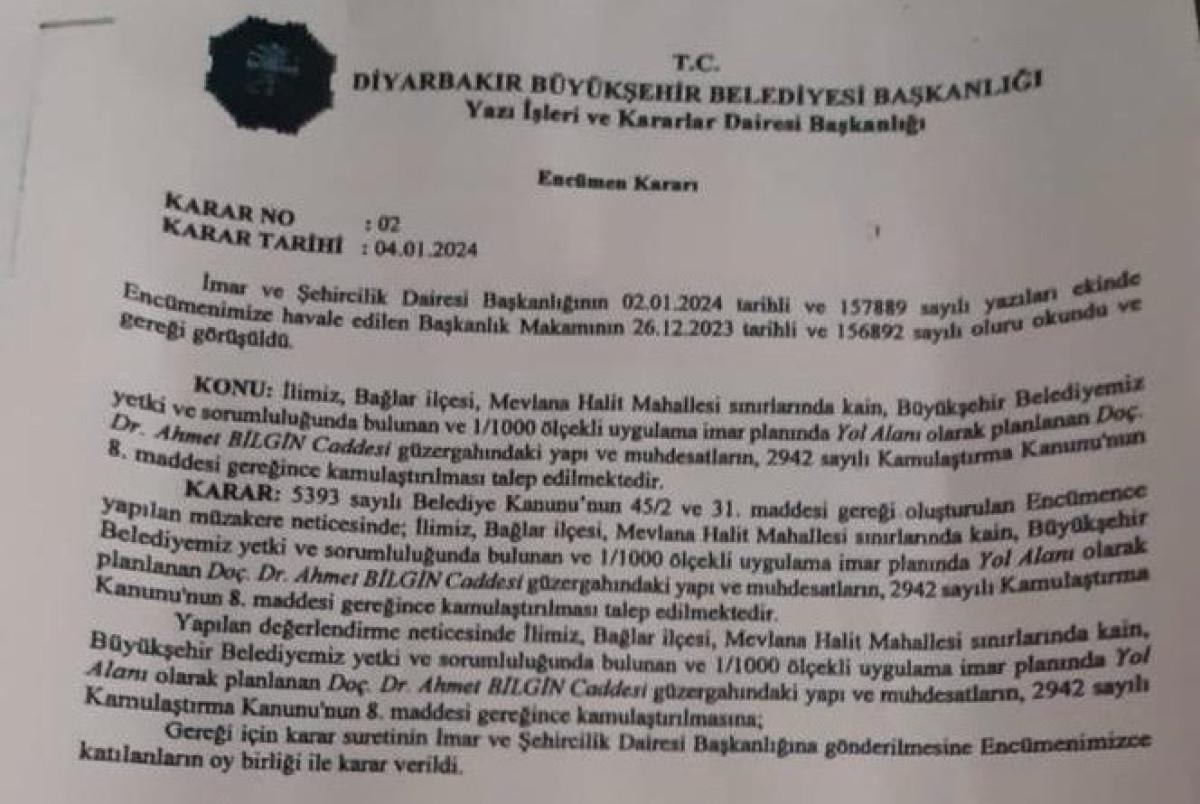 Bunun üzerine 04.01.2024 tarihinde Büyükşehir Belediyesi Yazı İşleri ve Kararlar Dairesi Başkanlığınca alınan kararda, bahse konu alanın kamulaştırılması talep edildiği, encümenlerin katıldığı oy birliğiyle onaylandığı ve İmar ve Şehircilik Dairesi Başkanlığınca kaçak yapının ivedilikle yıkılması belirtildi.