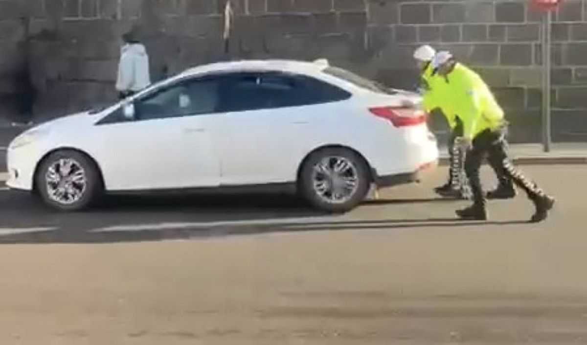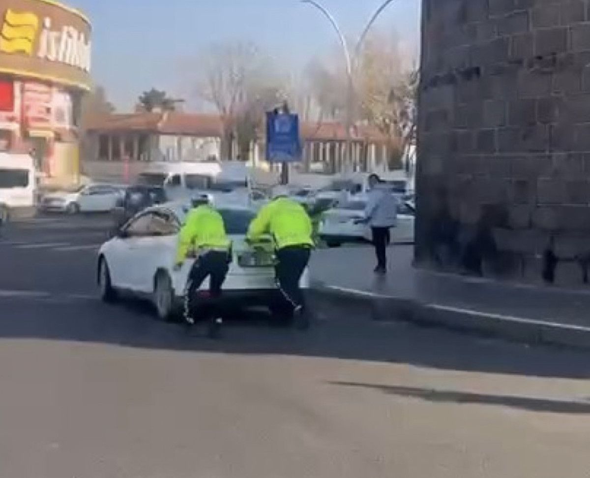 - Kavşakta görevli polis memurları, otomobili itip güvenli bir alana çekti.
