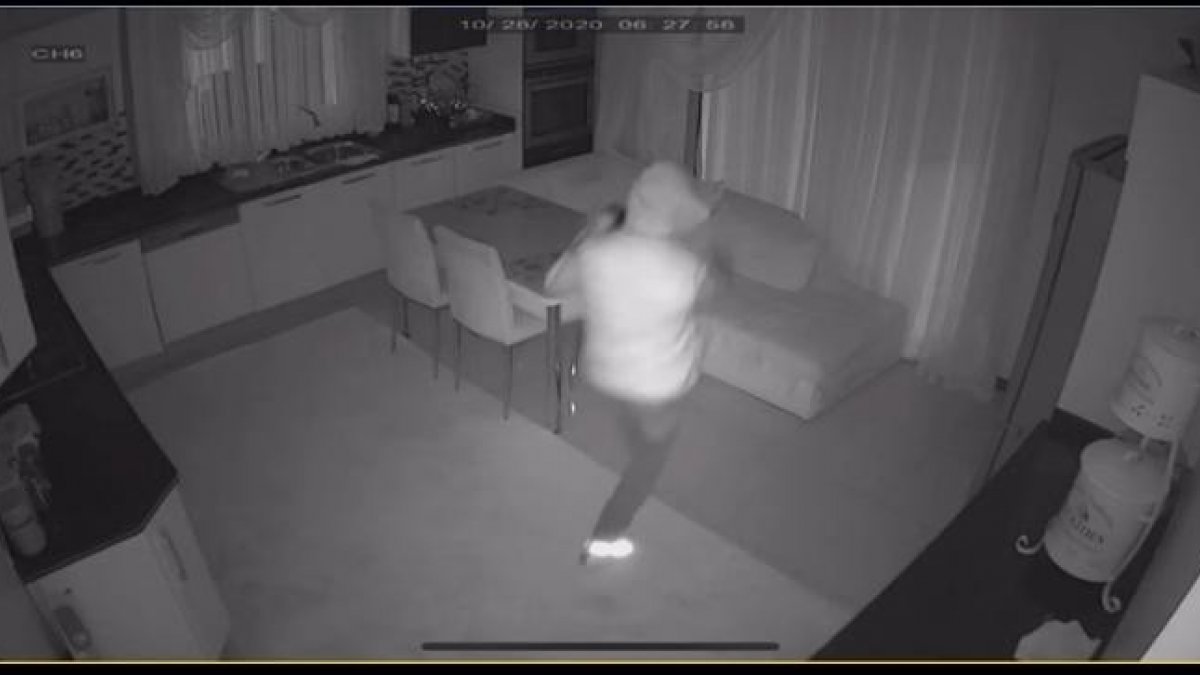 Evin tüm odalarını gezen hırsız, rüzgar sesinden korkmasının ardından girdiği pencereden kaçarak uzaklaştı. Tüm bu anlar saniye saniye güvenlik kamerasına yansıdı.