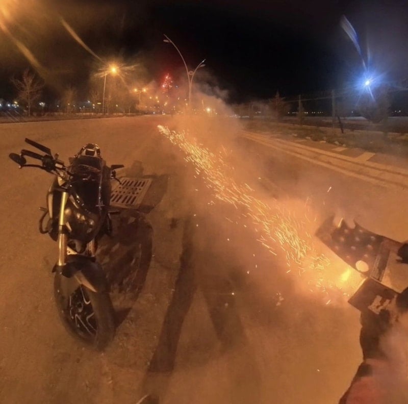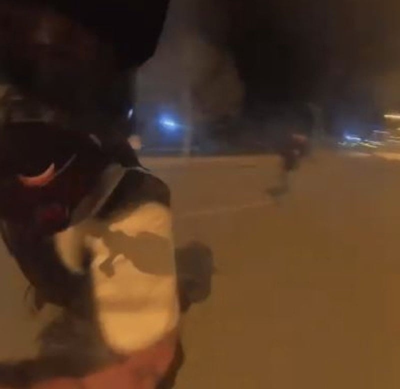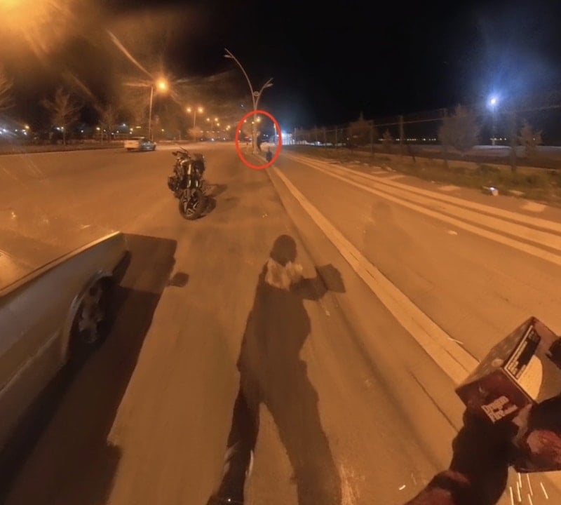 Sürücünün paylaştığı görüntülerde, havai fişeğin ateşlenmesiyle gençlerin panikle kaçıştığı, ardından yapılan şakadan hoşlanmayan bir kişinin motosikletliyi kovaladığı görüldü.