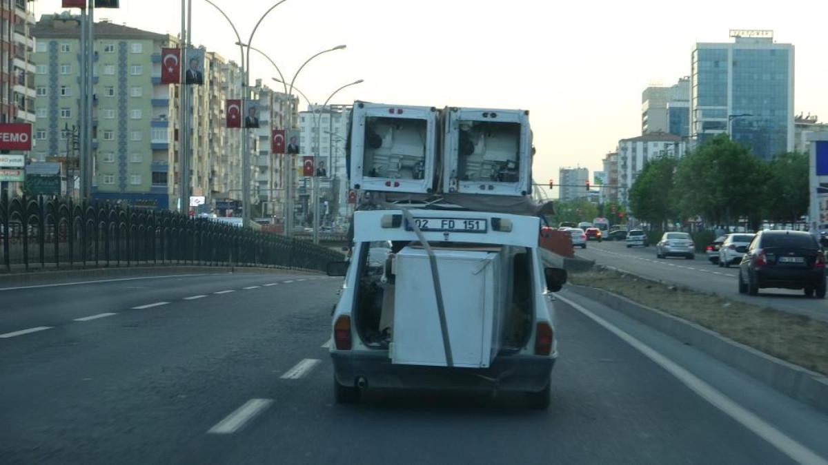 Sürücü, Diyarbakır-Şanlıurfa yolu istikametinde otomobilinin bagajına ve üstüne beyaz eşyaları yükleyip trafiğe çıktı.