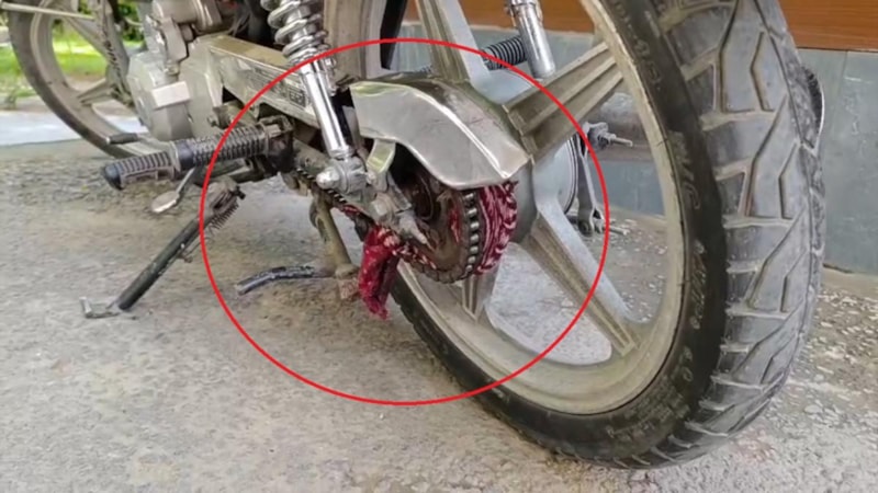 Ardından motosiklet sürücüsü, kadının elbisesinin zincire takıldığını gördü.