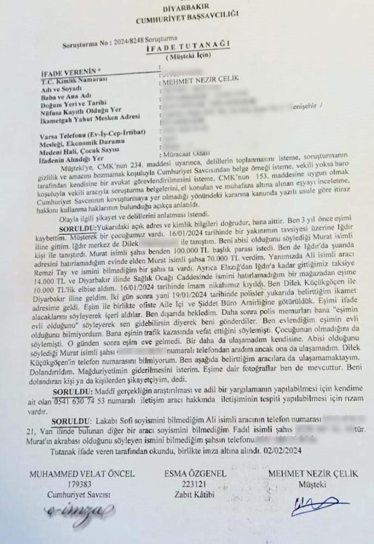 Dilek’in yanında ‘ağabeyim’ diye tanıttığı Murat diye biri vardı. Tanışıp kaynaştıktan sonra benden 100 bin TL başlık parası istediler. Ben bu miktarın çok olduğunu söyleyince başlık parasını 70 bin TL’ye indirdiler. Parayı Murat diye tanıttığı ağabeyine verdim. Anlaştıktan sonra Iğdır’da dini nikah kıydık. 16 Ocak’ta Dilek’i Diyarbakır’a getirdim. Dilek Diyarbakır’da 3 gün boyunca bizim evde kaldı.