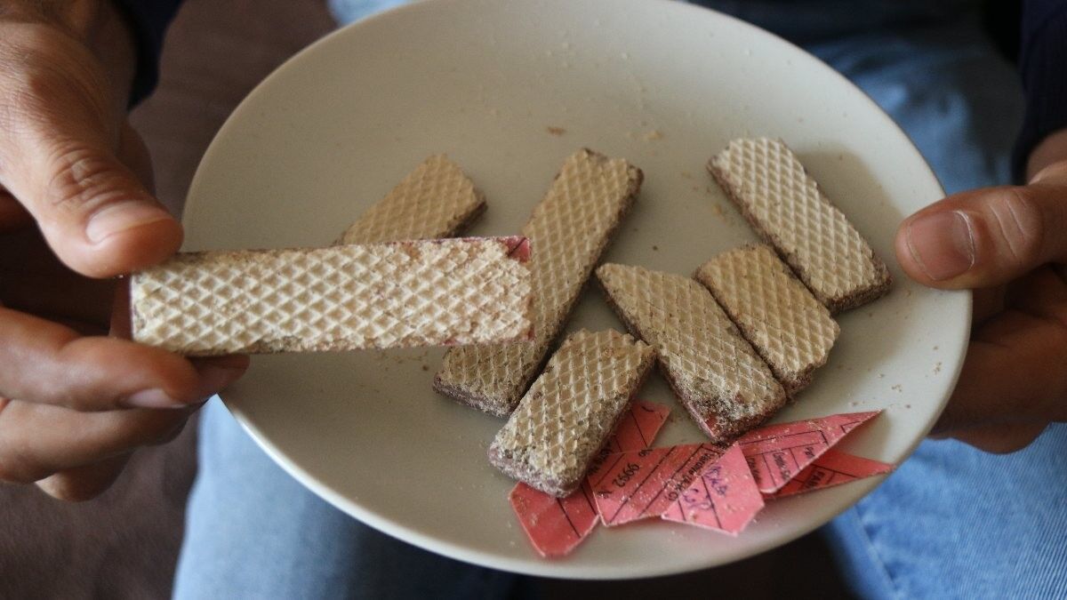 Esra Özden, parmağını çocuğunun ağzına koyup gofretin içindeki kağıt parçalarını çıkardı.