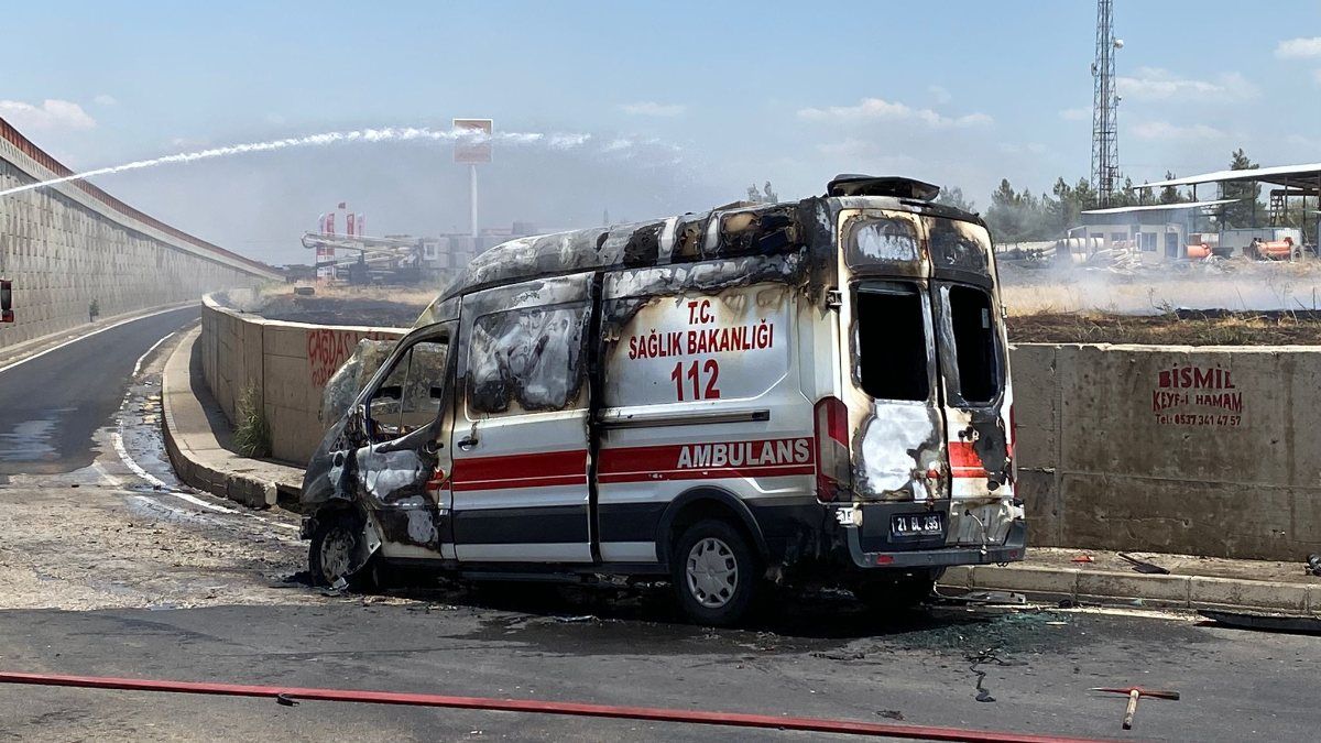 Diyarbakır- Mardin yolundaki Bismil ilçesi yol ayrımında, hasta almaya giden sürücüsünün ismi öğrenilemeyen 21 GL 295 plakalı ambulansta yangın başladı.