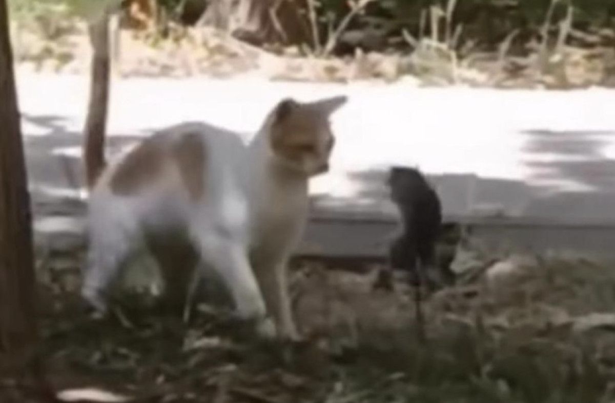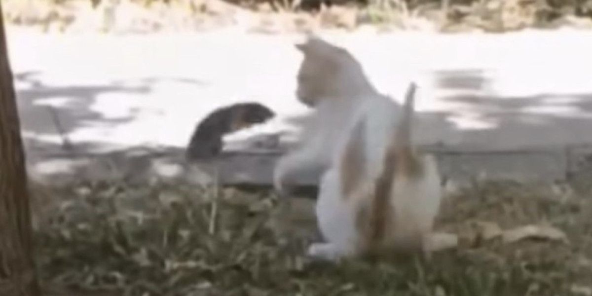 Görüntülerde, kedinin fareden korktuğu ve geri çekildiği, farenin ise cesur bir şekilde kedinin üzerine zıpladığı görülüyor.