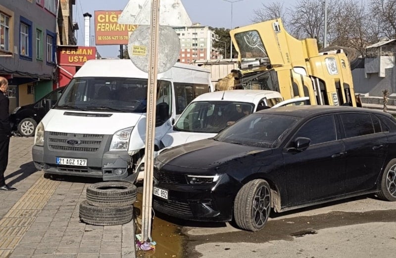Silvan ilçesinde saman yüklü kamyon, park halindeki 9 aracın üzerine devrildi. Kamyon şoförünün yaralandığı kaza, kameraya yansıdı.