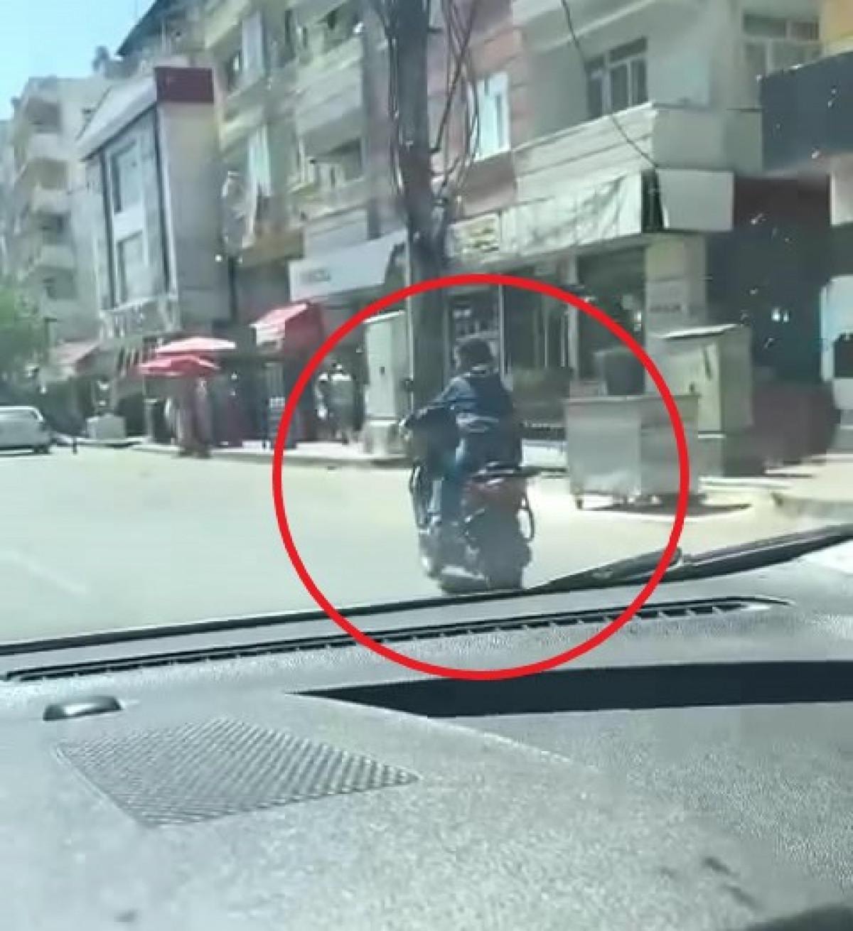 12-13 yaşlarındaki bir erkek çocuğu, Sunay Caddesi'nde motosikletin üzerine yüzüstü yattı, bir süre trafikte böyle ilerledi.