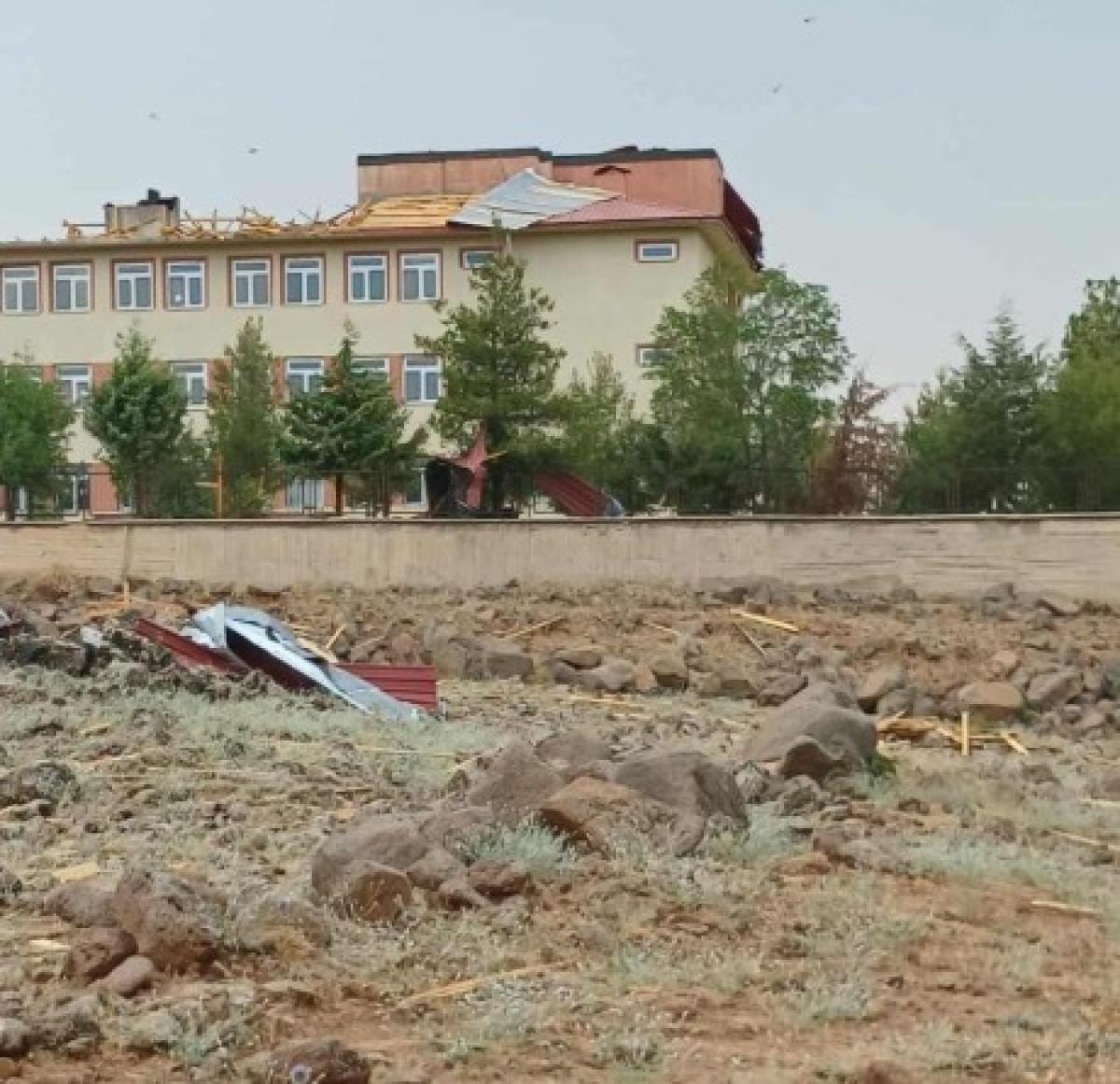 İlçeye bağlı kırsal Arabük Mahallesi'ndeki Arabük İlk ve Ortaokulu'nun çatısının bir bölümü kuvvetli rüzgarla uçtu.