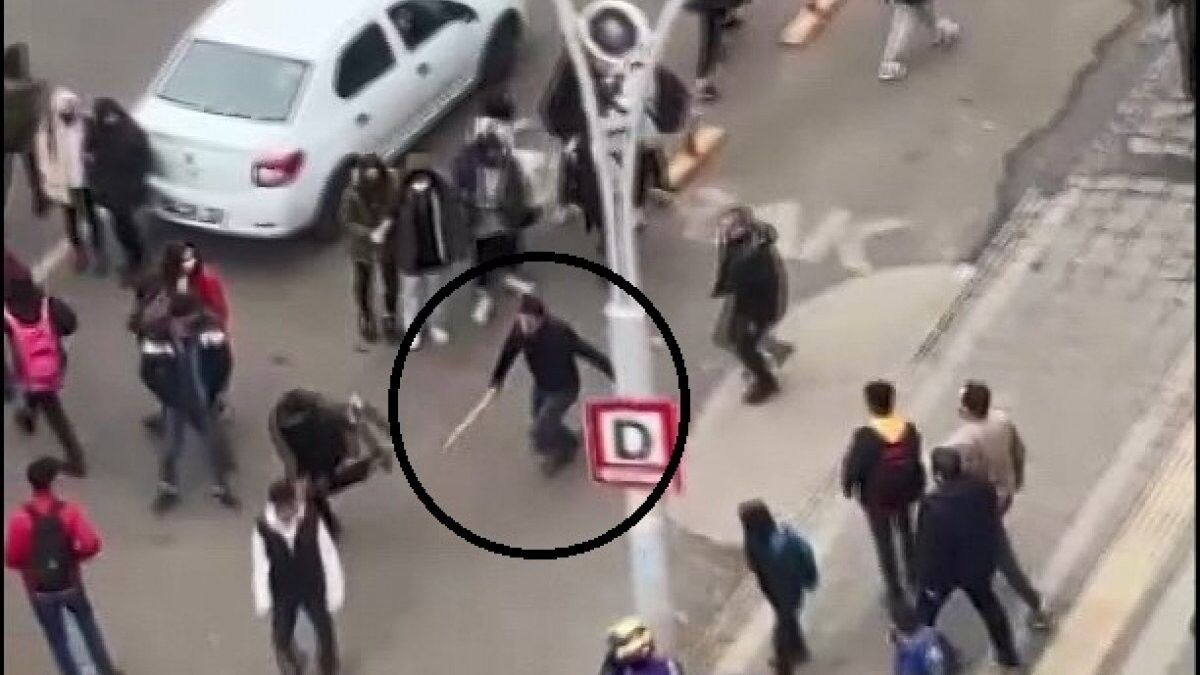 Bu sırada bölgede esnaflık yapan bir kişi, elindeki sopayla öğrencilere müdahale etti.