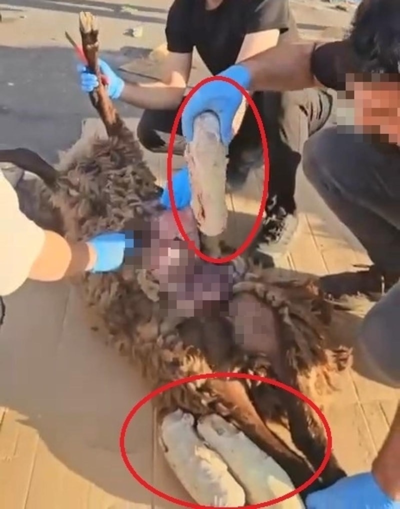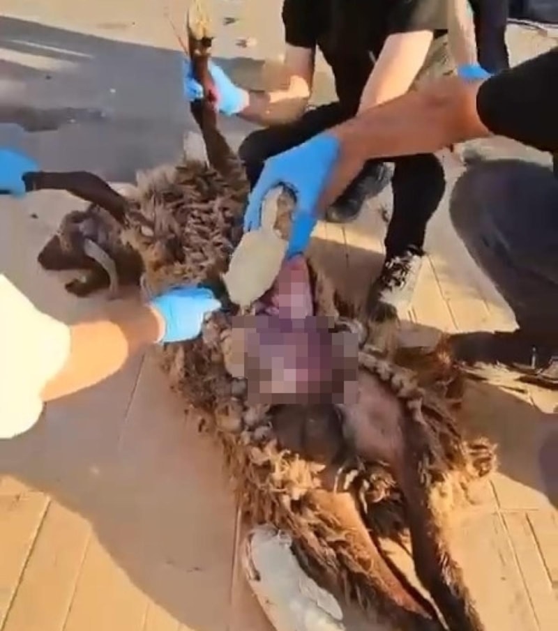 Hayvanı araçtan indiren ekipler, karın boşluğunu açarak yaptıkları aramada paketler halinde uyuşturucu madde ele geçirdi.