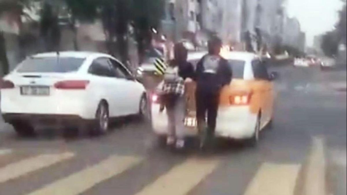 Trafiğin yoğun olduğu sırada ticari taksinin arkasında yolculuk yapan gençler, hayatını tehlikeye attı.