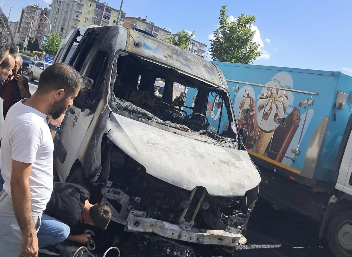 Diyarbakır'ın Kayapınar ilçesinde şehir içi minibüs, henüz belirlenemeyen nedenle alev almaya başladı.