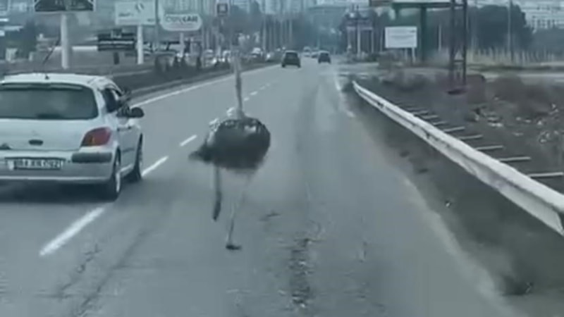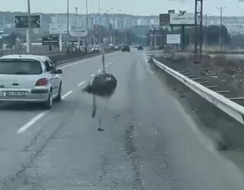 Çiftlikten kaçan deve kuşu, trafikte sürücülere zor anlar yaşattı.
