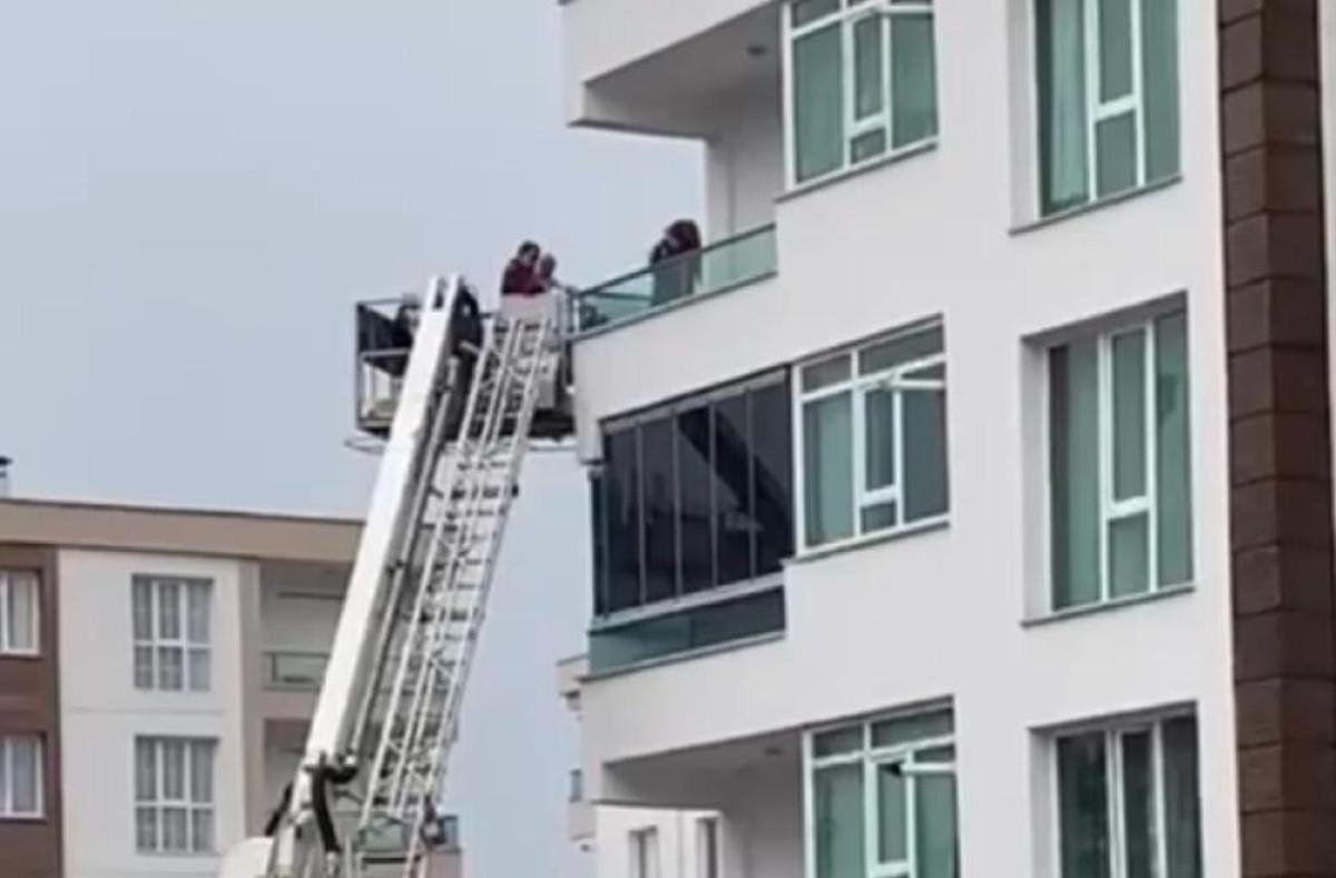 Üst kattaki dairede mahsur kalan anne ve çocuğu, itfaiye ekipleri tarafından yangın merdiveniyle aşağı indirildi.
